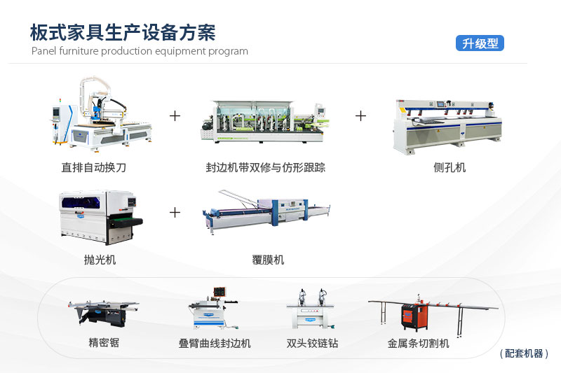柜體/柜門(吸塑/平板)生產(chǎn)解決方案主要由直排換刀加工中心、封邊機(jī)、側(cè)孔機(jī)、拋光機(jī)、覆膜機(jī)、精密鋸、疊臂封邊機(jī)、雙主軸鉸鏈鉆、金屬條切割機(jī)組成,可滿足全屋定制廠家的生產(chǎn)加工,機(jī)器組合靈活,工藝多變,打造符合客戶整廠需求的自動化生產(chǎn)模式。