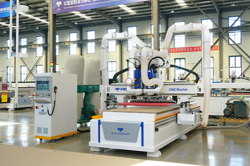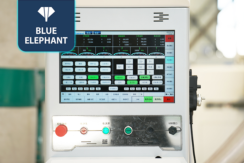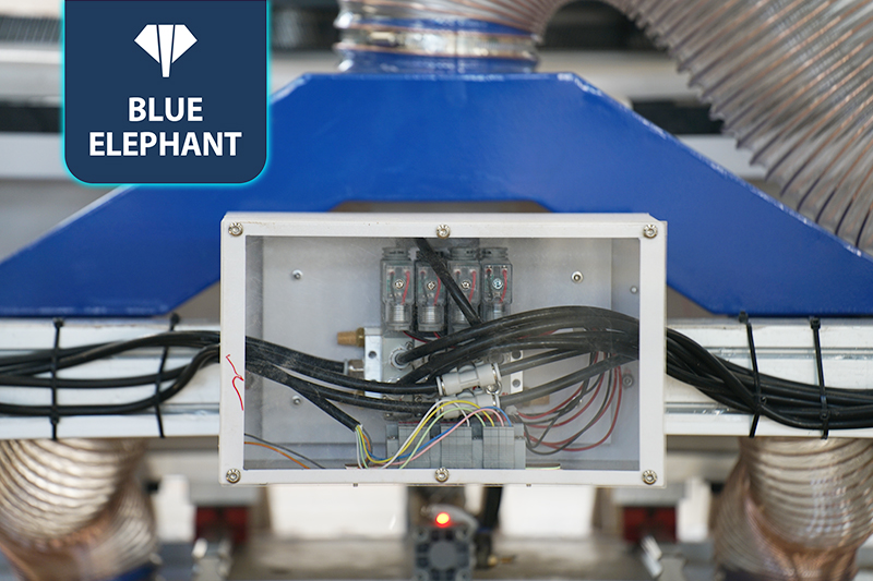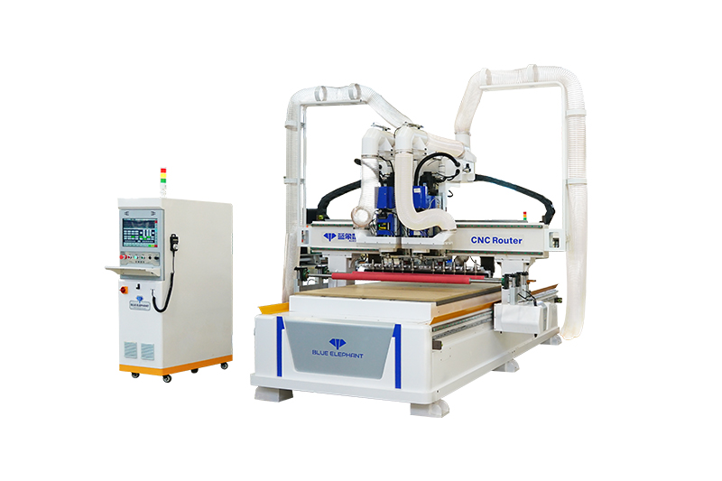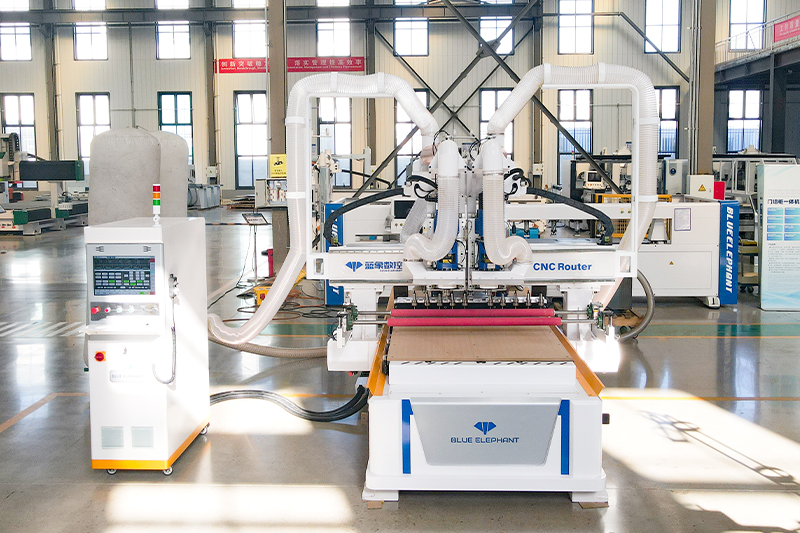 2.共兩套的9KW大功率主軸配備12位直排刀庫(kù)(每個(gè)主軸可配6把刀),高速開料,刀庫(kù)合理分配,互不干擾;