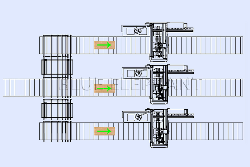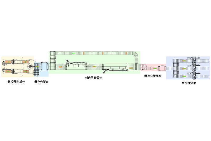 板料由動(dòng)力滾筒輸送至封邊機(jī)→由第一臺(tái)封邊機(jī)完成第一條邊封邊→第二臺(tái)封邊機(jī)完成第三條邊封邊→板材回轉(zhuǎn)再次完成第2、4條邊封邊→完成封邊的板材進(jìn)入緩存?zhèn)},一次排隊(duì)輸入打孔鉆單元