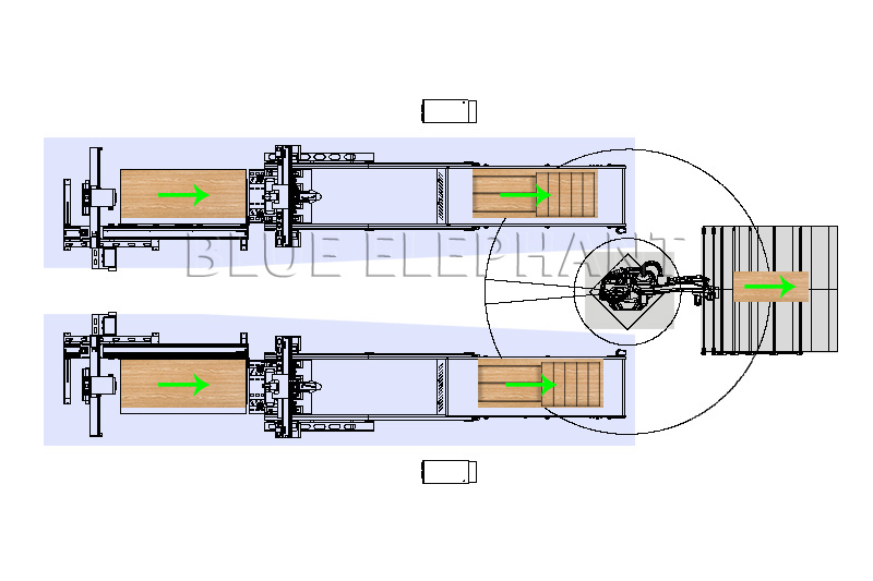 叉車(chē)送料至升降機(jī)→貼標(biāo)機(jī)抓取板料自動(dòng)貼標(biāo)→開(kāi)料機(jī)鉆孔、開(kāi)槽、開(kāi)料→機(jī)器人抓料送至平移動(dòng)力輸送輥臺(tái)→進(jìn)入緩存?zhèn)},一次排隊(duì)等待運(yùn)送至封邊單元