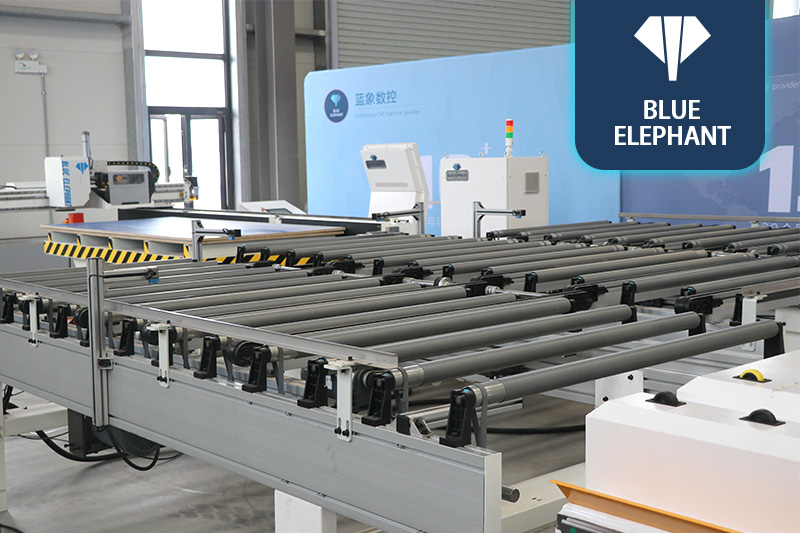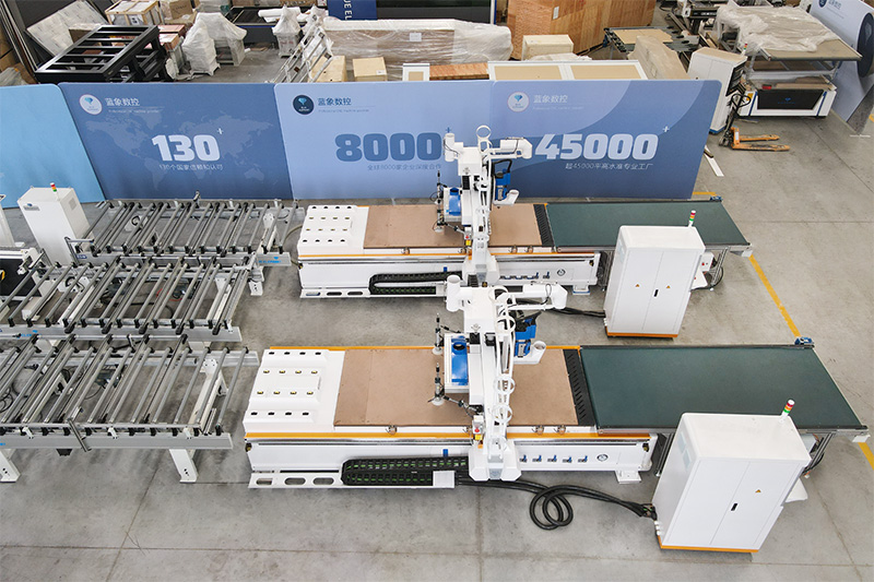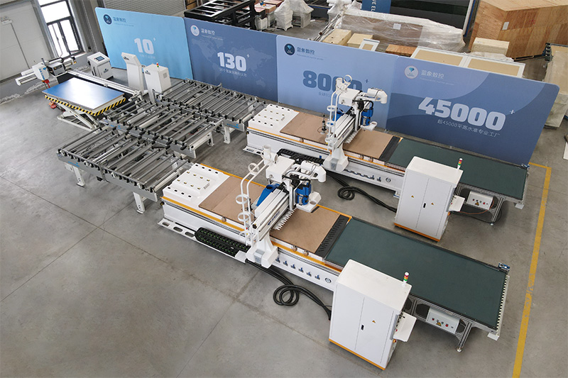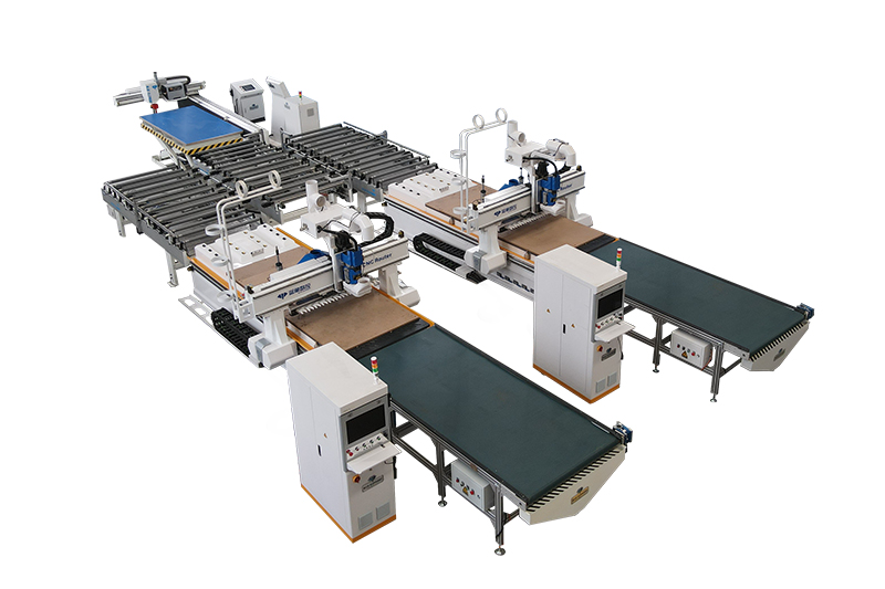 一拖二開料單元是一套自動(dòng)化程度比較高的數(shù)控開料解決方案。開料單元由一臺(tái)高速自動(dòng)貼標(biāo)機(jī)、兩臺(tái)全自動(dòng)數(shù)控開料中心以及動(dòng)力滾筒線、中控系統(tǒng)組成。人工只需將板材放置在升降機(jī)上,由貼標(biāo)機(jī)自動(dòng)貼標(biāo),再由中控系統(tǒng)自動(dòng)分配至開料中心,完成板材切割工作。如選配機(jī)器人系統(tǒng),可由機(jī)器人完成碼垛,余料利用及廢料輸出等工作。
